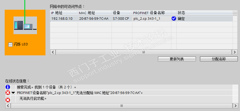 一块CPU-315-2DP,一块CP343-1(V3.1版本)的以太网模块,在博图V14下通过CP343-1下载程序、监视都是没有问题,但是在给CP343-1分配Profinet设备名的时候一直报错,提示不能分配!见附图所示。大家有没有遇到这种情况?是什么原因导致的啊?