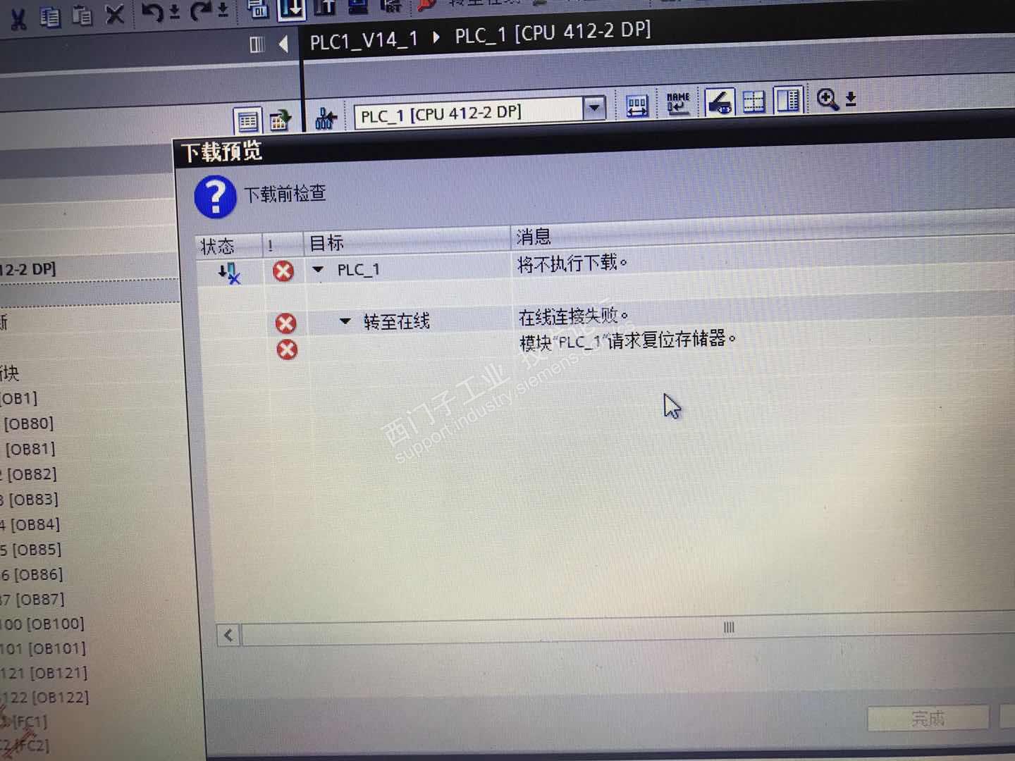 使用博图V14组态好S7400,下载就出现请求复位存储器,看帮助也看不出什么,看站里以前的文章也没解决什么问题,按照步骤做了,stop灯常亮和闪烁状态都试过了,也没用,就截图2副,帮我看看啥情况