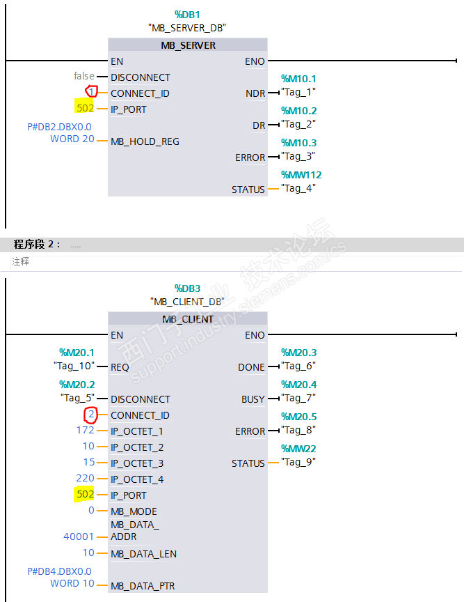 S7-1200手册上说“每个IP端口只能用于1个连接”,但是我用下面的程序确实实现了“同一个IP端口用2个连接ID各自读取对方寄存器内数据”的功能。这是为什么?