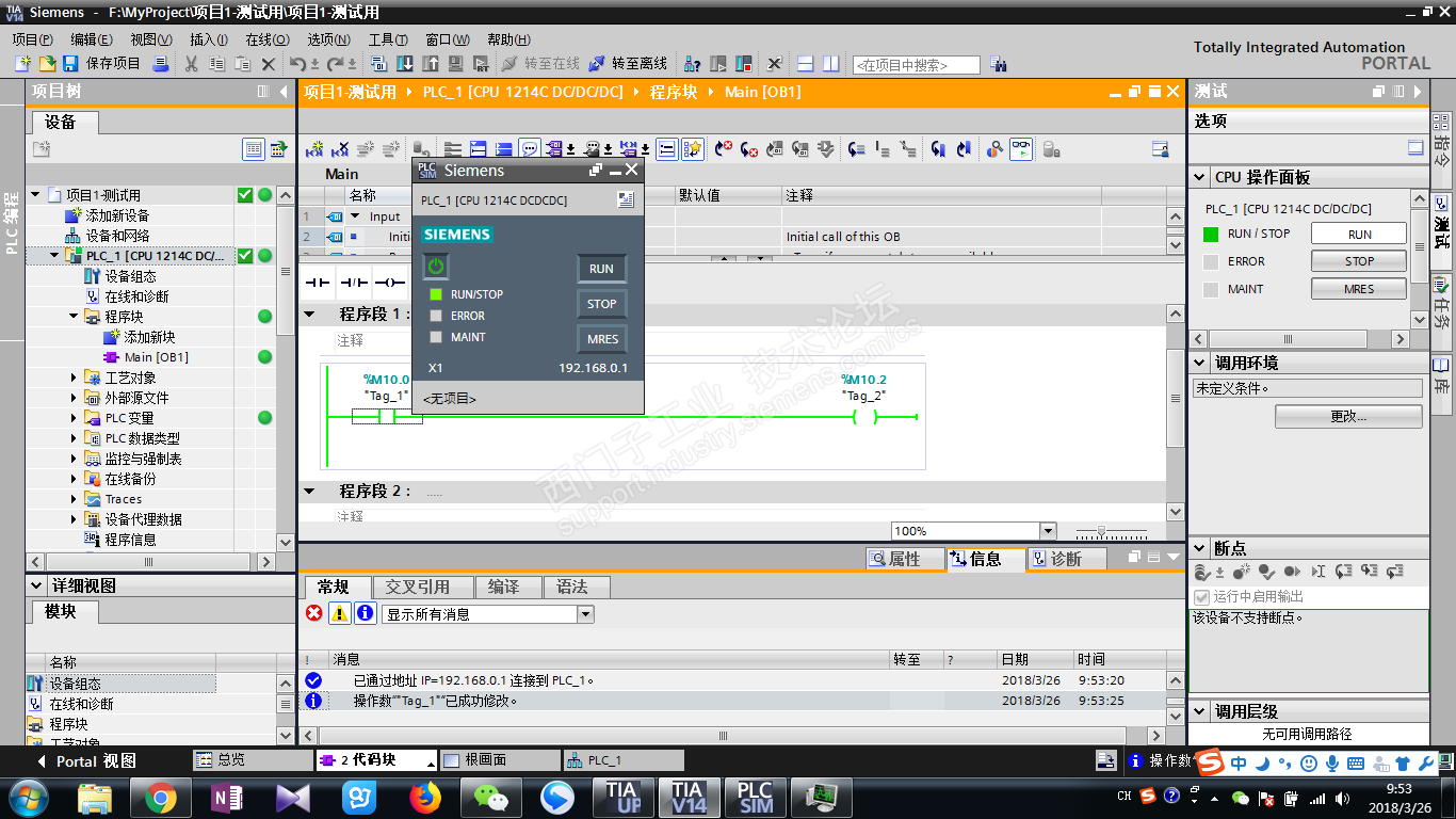 这操作不好,要不得。看了发的一下时间就原谅ta了。机智的我马上开启更新软件,果然看到一个更新(忘记截图了)有一个S7-PLCSIM V14 SP1 Upd1的更新,果断下载安装,重启一下果然可以仿真了。然后手贱似的又找了一个1200的plc去仿真,居然真的就可以仿真了,太意外了,哈哈哈。