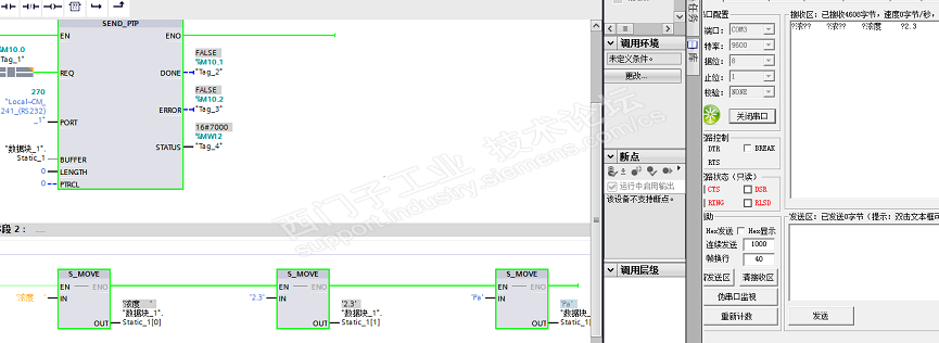 S7-1200与打印机通讯,要发送 浓度,湿度,压力。称重的数据总共四个条打印名称-数据-单位,程序里要如何做,没用过1200的,第一次用,最好能给个例程,打印机荣达RD-D40IN,cup1215c加1241-232,按网上教程做了个程序,然后用串口调试工具,串口接收的发送的数据不全,或带问号,不知道哪里设置出问题