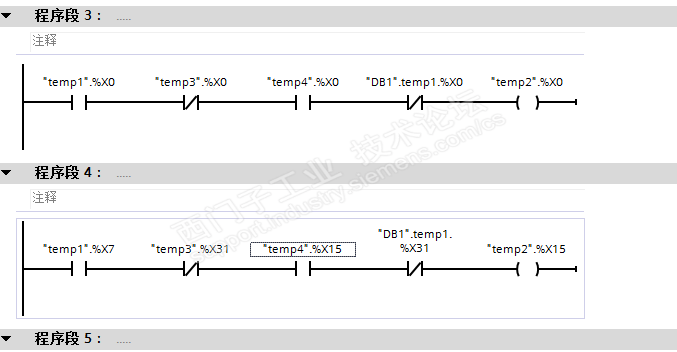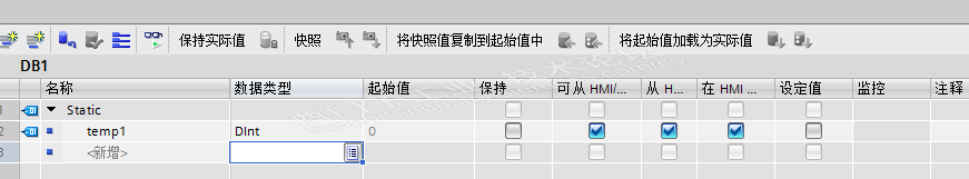 首先我们建立一个变量表,在其中建立四个变量,分别为temp1、temp2、temp3、temp4,数据类型分别为字节、字、双字、整形,建立一个名称为DB1的DB块,在其中建立一个双整形变量,temp1。建立完成之后,我们开始调用这些变量。如下图所示