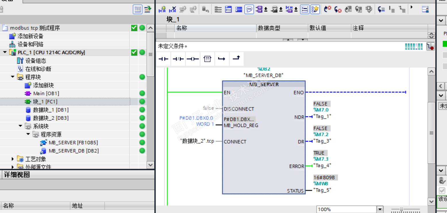我用1200 mudbus tcp 通讯,都设置好了,不知道怎么用测试软件测试就是联不通,还模块故障码809B,但是interfaceID没错呀,是16进制的40,帮我看看问题在哪里