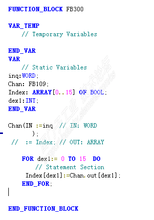 做了个FB109,输出引脚为Array[0..15] of bool(见图1).然后在FB300里面调用它,结果FB109输出引脚不知道如何填写了?试了两种写法(见图2,图3)编译都通不过,应该如何对应这个数组格式引脚啊?请高手帮忙。