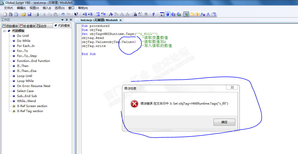 wincc用VBs脚本,程序编译报错,不知道什么原因,帮忙分析下