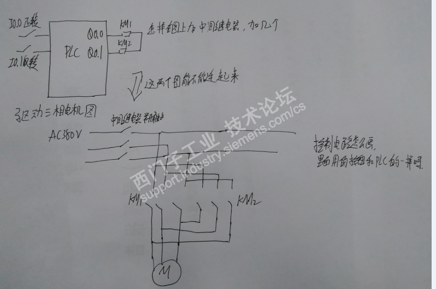我想用S7-200 Smaert PLC控制三相异步电机(380v,接触器驱动),但是我的CPU是ST40的,输出电压为24v,有的人说在输出模块哪里加个中间继电器,用他的常开触点驱动接触器,我不是太明白,希望大神们用纸给我画个简略图,下面是我想的图,请多指教,谢谢