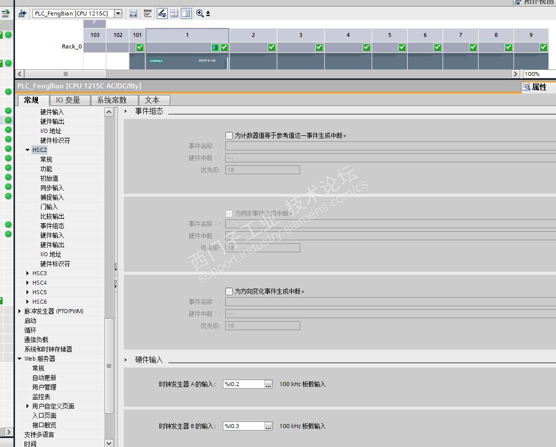 1200PLC(CPU1215C)接入两个增量型编码器,AB计数,加方向,PLC程序中第二个编码器HSC2(I0.2和I0.3)在程序中有断电保持和更改当前计数功能,梯形图及配置如图,更改计数器当前值后,发现HSC2只能进行减计数,手动正方向旋转编码器,数值减小,手动逆方向旋转编码器,数值还是减小!(另一个编码器HSC1在程序中无断电保持和更改当前计数功能,默认ID1000值,能正常加减数读取),寻求平台各工程师们帮忙指点下,程序有无问题或需要在程序中做何更改,非常感谢!
