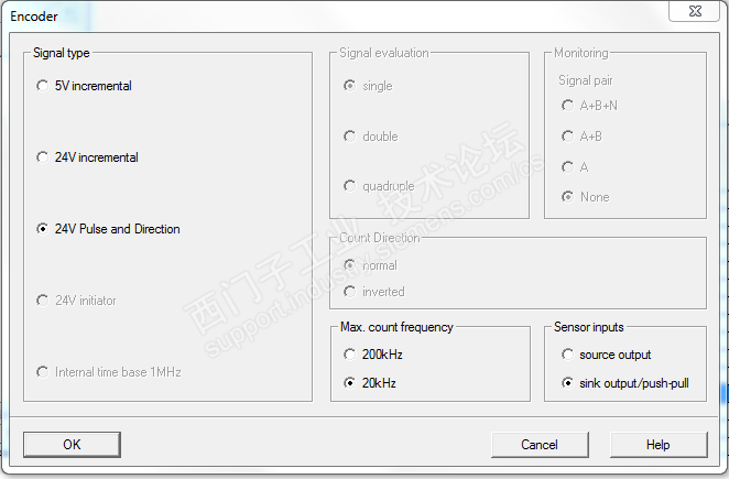 其他的都是默认值, 然后程序采用和入门中的实例是一样, 还是没有办法计数, 编码器信号是有的,能够达到门槛值, 然后我把计数模块更换为新的, 然后再前面的步骤走一边,但是新的模块SF 红灯亮,HW 在线 FM350_1 Diagnostic buffer 中信息为:Event 1 of 2: Event ID 16# F583:8007Incorrect parameters in moduleInternal error, Incoming event ,Event 2 of 8: Event ID 16# F483:8007Incorrect parameters in moduleInternal error, Outgoing event(Coding: 16# F483 8007 0000 0000 0000 0000)