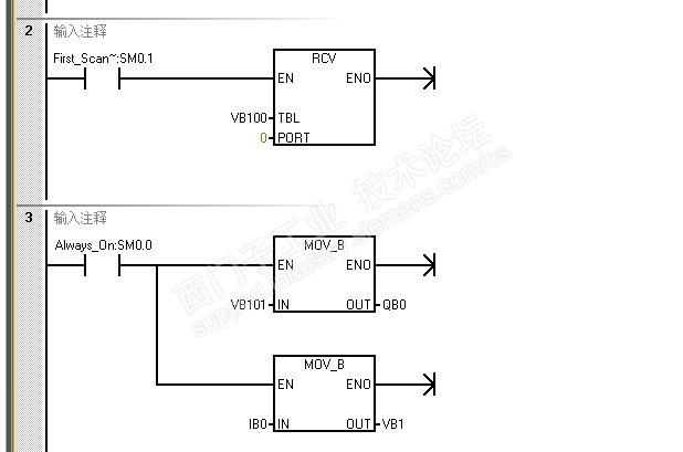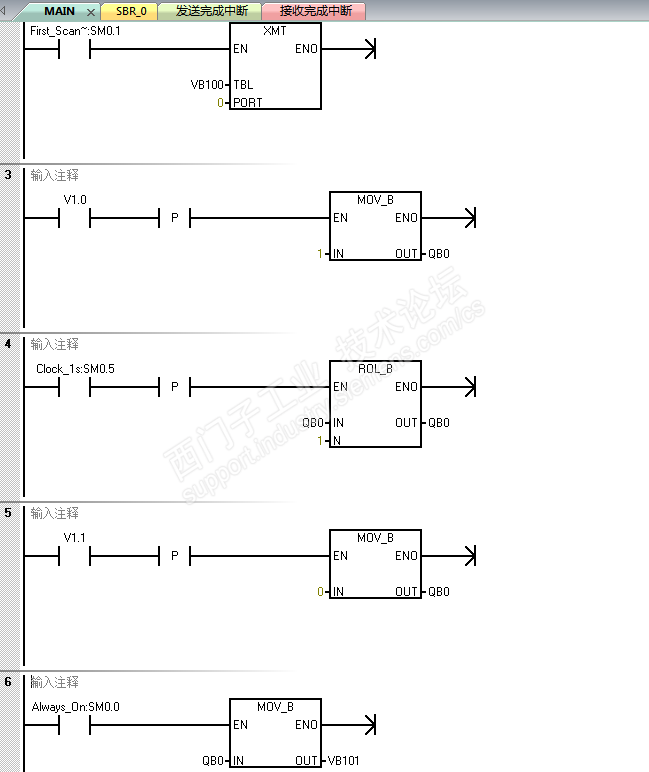 两个CPU之间用自由口通信,要求CPU2中的I0.0可以控制CPU1的QB0从Q0.0开始,依次量灭1s;同时CPU2的QB0动作和CPU1相同;CPU2的I0.1可以控制流水灯的停止。