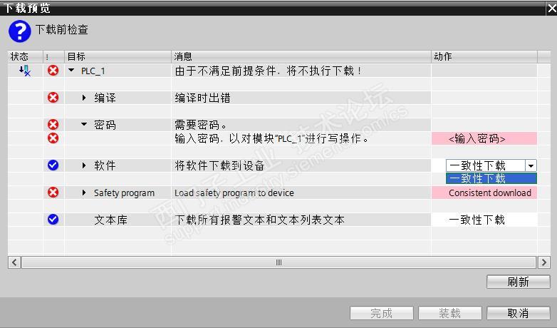各位朋友,在大家的帮忙下,目前离线和在线的程序已经一致了,可以在线查看了。但是现在又遇到了一个新的问题。因为目前在线的程序温度控制方面存在缺陷,需要修改,但是我手上的程序是老外离开中国10天前给的程序,目前最新的程序还不肯给我们。我之前没用V14下载过程序,v14不像step7,感觉还是step7下载界面简单。我按照图一的方法,选中要下载的快,点击下载到设备。我这个步骤应该没问题吧?然后就跳出来图2的界面,一是需要密码,二是安全模块一致性下载存在问题。可是我现在想要下载的模块是一个普通的模块,我就打开plc,访问权限如图3所示。我的理解是,只要不下载故障安全模块,应该是不需要密码的。请问大家,我的理解是否正确?我也不知道是不是老外最后一天走之前,把这里的√都打上了,我个人觉得这个可能性比较低。
