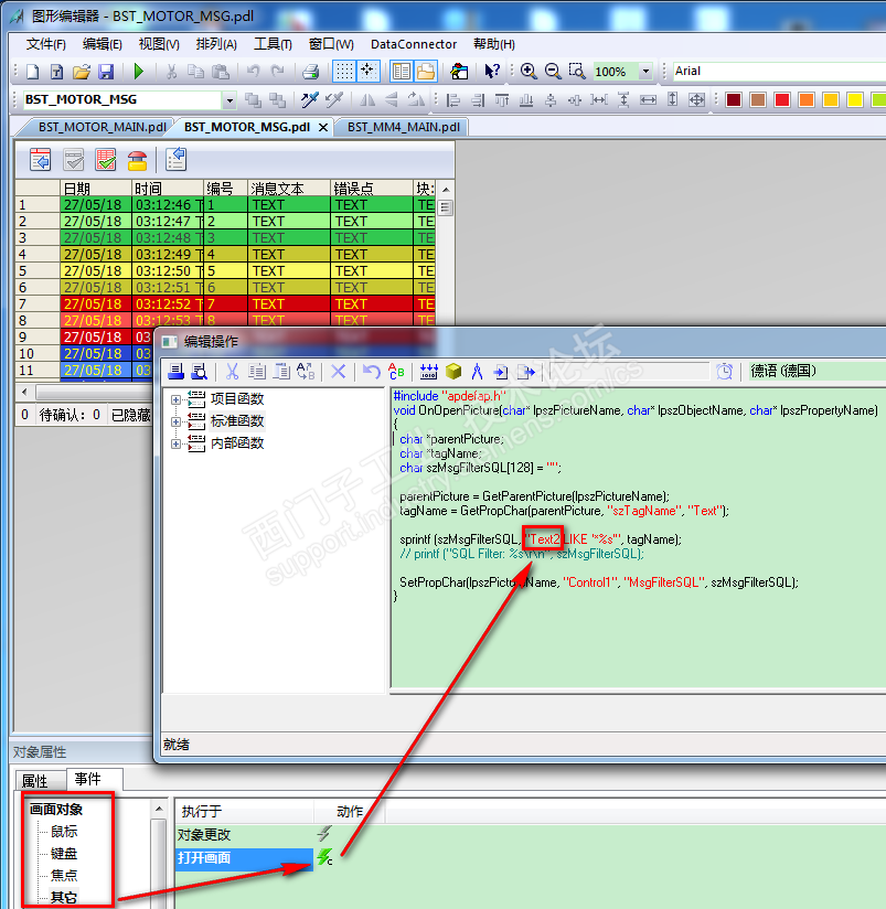 2. 在报警记录-消息-错误栏下添加报警变量,错误点填写设备名称(此处为Screw1,Screw2)