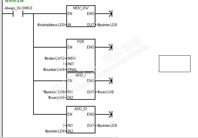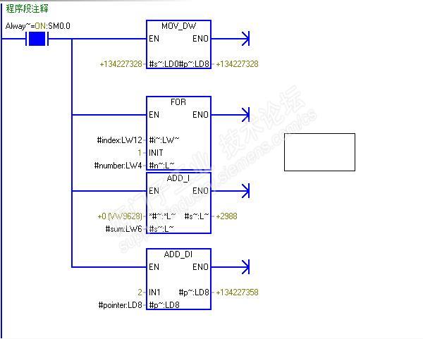 如图所示,就是用for-next指令和循环指针做了一个累加的子程序,多出一个2988的值,计算结果减去2988就可以,不知道这2988的值怎么来的,后来我在网上也看到相似的子程序,就是多了一个AC1中转,我加上AC1中转还是基数值位2988,请各位不吝赐教,看看我的程序问题在哪,谢谢。