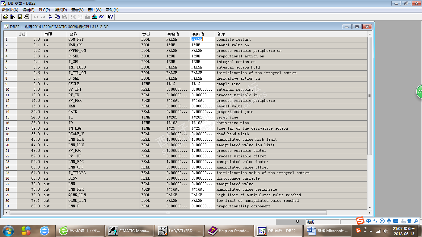 经过仔细分析程序发现,由于我在编程的时候误把MAN_ON(手动)参数的变量DB60.DBX0.2连到了COM_RST(初始化)参数上了。发现问题后立即修改了程序重新调试,发现还是没有输出 ……