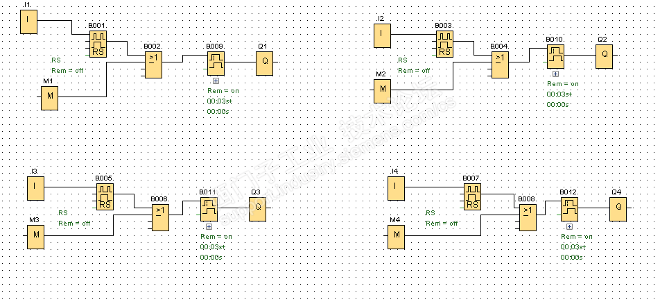 1、LOGO 230RCEo实现输入控制输出,输入接的是自复位开关面板,如 I1~I4,对应 Q1-Q4,但同时又