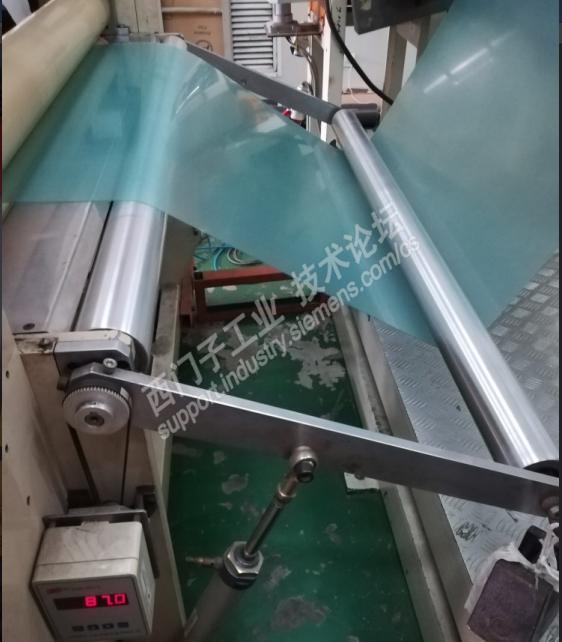 从图中可以看出,记长机构使用了一个缓冲架并且加装配重,给薄膜一个张力拉紧,缓冲架下面有一个气缸,上面气口是一个节流式消声器,下面的气口接到一个二位五通单电控气动阀,主要目的就是刚开机时,气动阀工作气缸向上升,让缓冲架抬到最上位,穿薄膜过去后电磁阀就不工作了处于自由状态了,相当于上下气口都是打开通室外大气的。