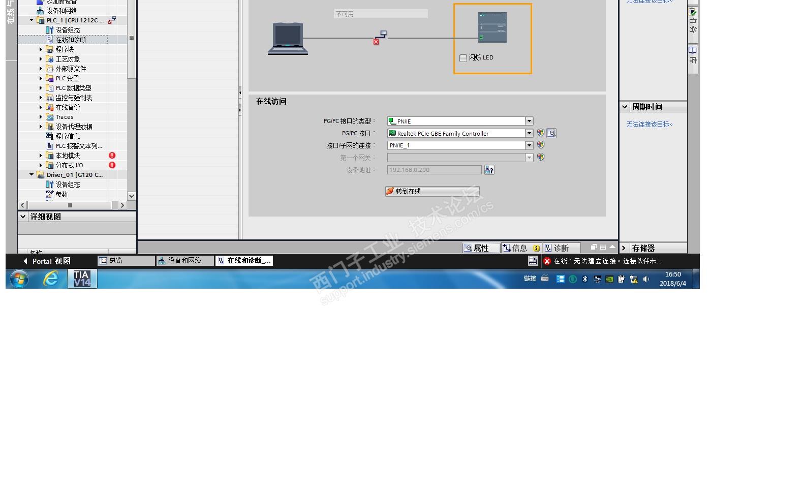 新购买一台S7-1200PLC, 是CPU1212C DC/DC/DC型,尝试着笔记本电脑用网线直连PLC(profinet 口),参照手册觉得很简单的设置操作就可以实现。谁知道死活就是连不上。仔细检查过硬件组态和实际一致,在项目树--在线访问--可更新设备下,点击后检测不到PLC,于是使用ping 命令无法ping的通,于是参照论坛里诸位的建议:换网线,关闭防火墙,关闭杀毒软件,检测电脑网卡,都没有作用。于是找了一台S7-200Smart PLC,却可以连上,所以打消了我对前面各项的怀疑。整整折腾了一天,还是连不上,不知到哪里出了问题。请浏览图片,请各位大佬支个招,不胜感谢。系统是WIN7 旗舰版64位的,软件是博图TIA V14 SP1.