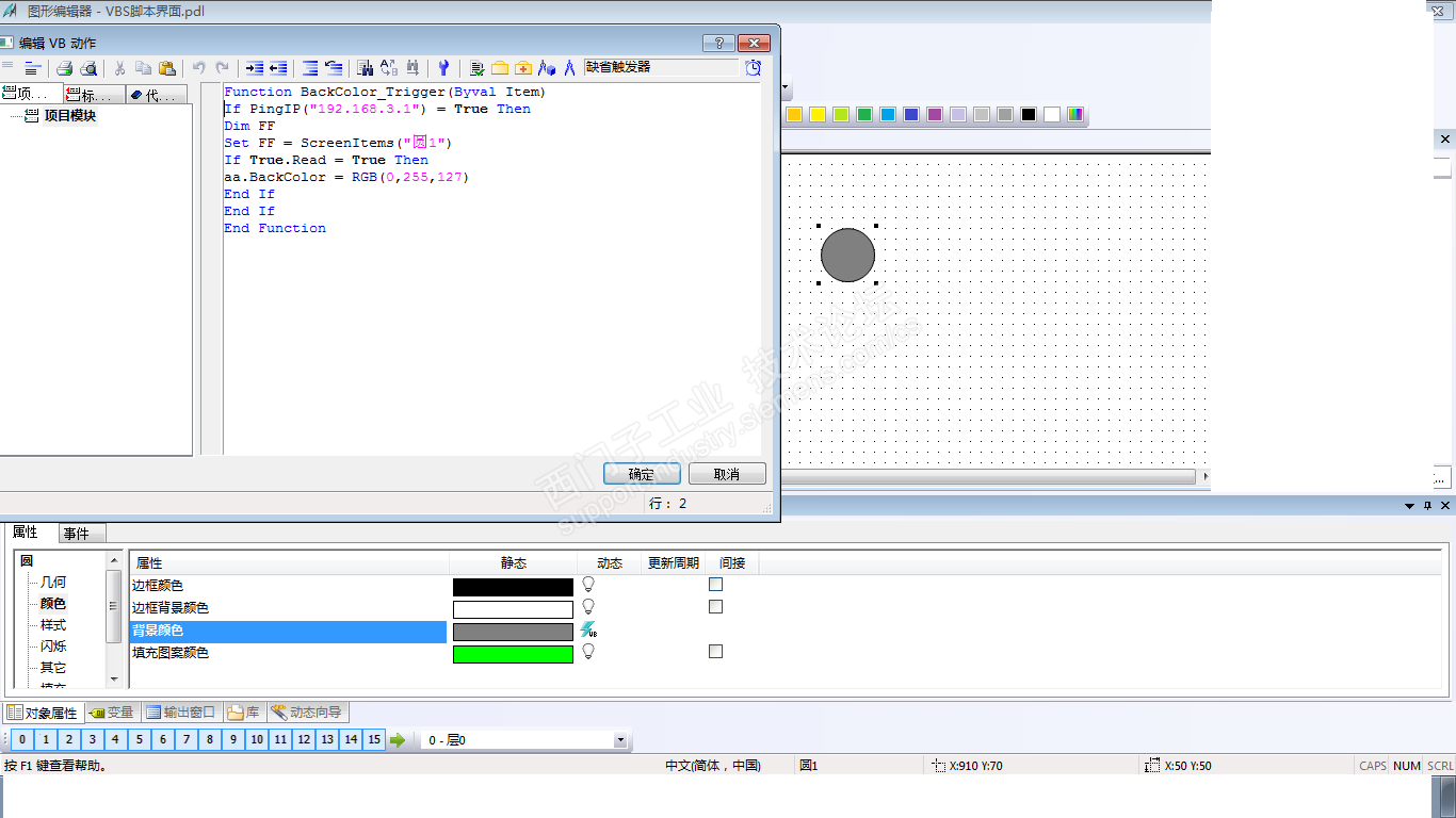 在wincc项目里写一个脚本(vbs)拼IP地址,用于监测网络连接状态,能拼通为绿色1 ,不通为红色,求指教,修改。