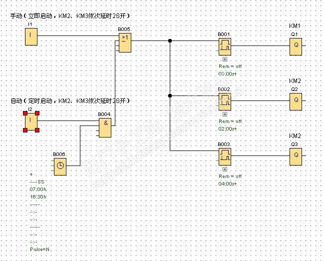 2、输出只需要三个就够了,两个延时时间相同的时间继电器的信号输出可以采用或门,后面接Q点输出。