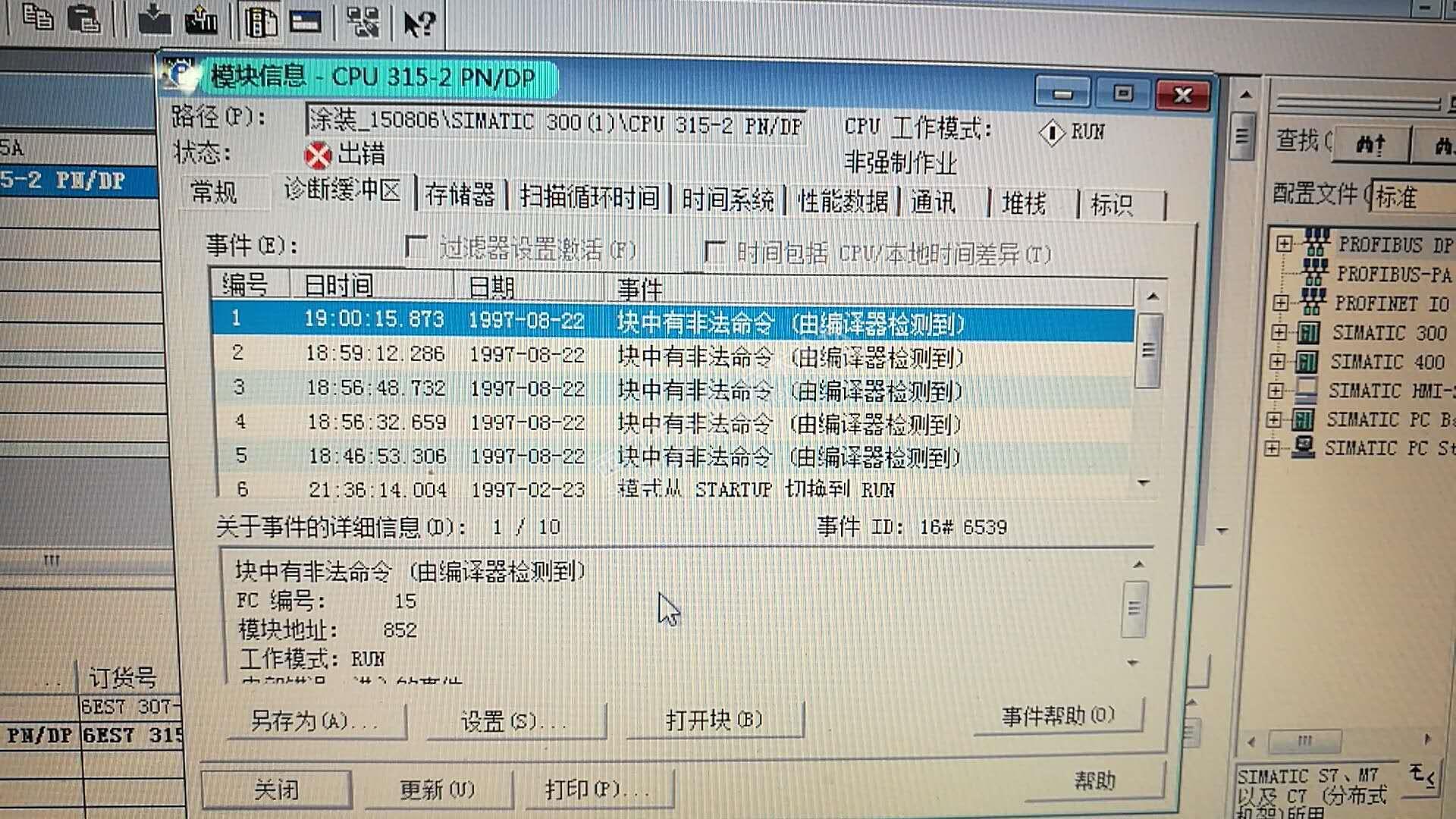 各位师傅们好,有个问题想请教一下,PLC 上显示系统错误,在线查看是fc15编译出错误了,但是打开FC15后,无法编译该功能,请懂的人指教一下。有图请看