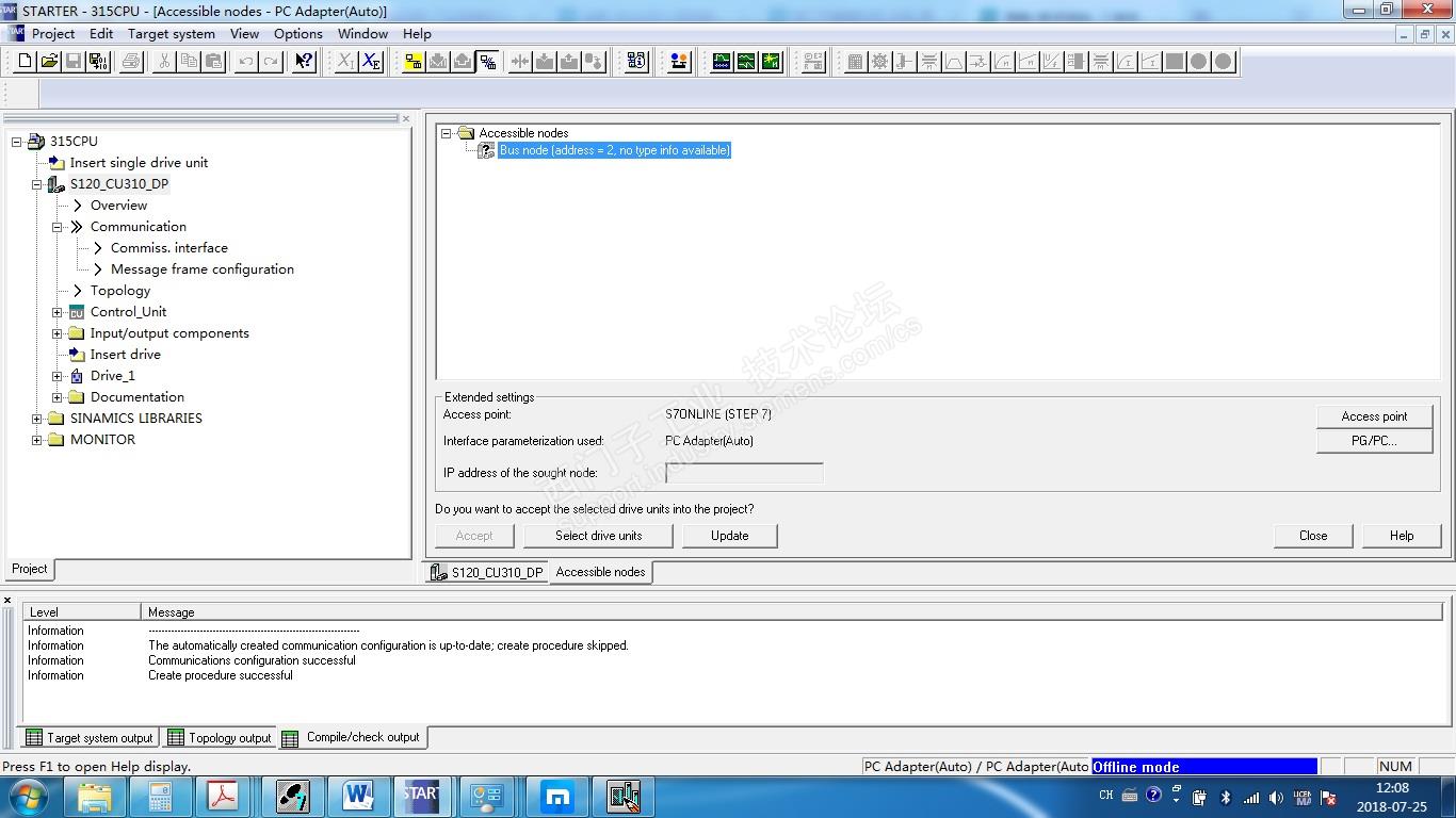 硬件组态S7300和CU310,在线正常无报警,从STEP7 commisioning转到starter无法在线,可访问的节点可找到,见图。卡了一上午了