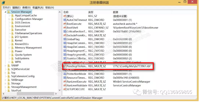 2、找到HEEY_LOCAL_MACHINE\SYSTEM\CURRENTCONTROLSET\CONTROL\SESSION MANAGE\下的PendingFileRemameOpeaations键,查看该键,将该键所指向的目录文件删除,然后删除该键,或者直接删除该键值。不需要重新启动,继续你的软件安装即可。
