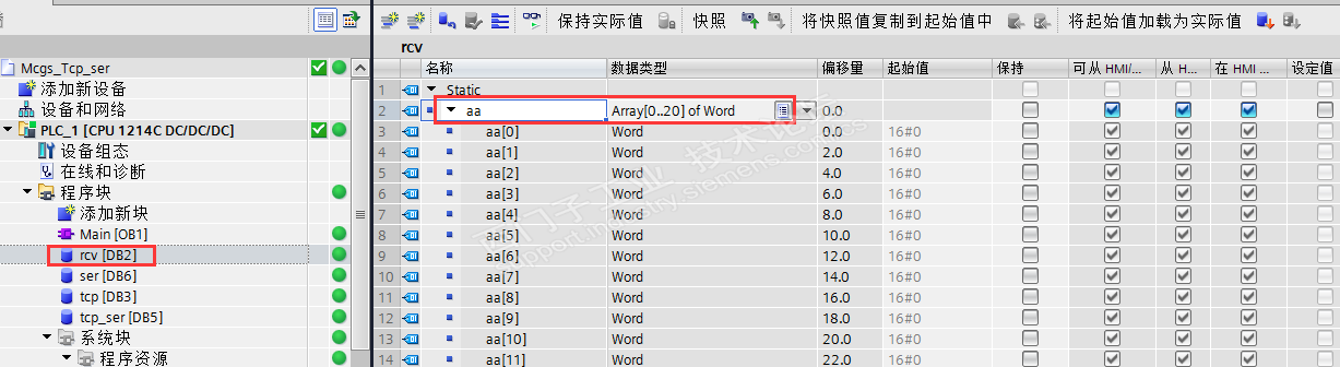1.3. 1200PLC客户端数据块rcv(存放数据)和网络连接数据块tcp(存放网络连接参数)