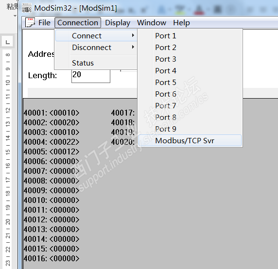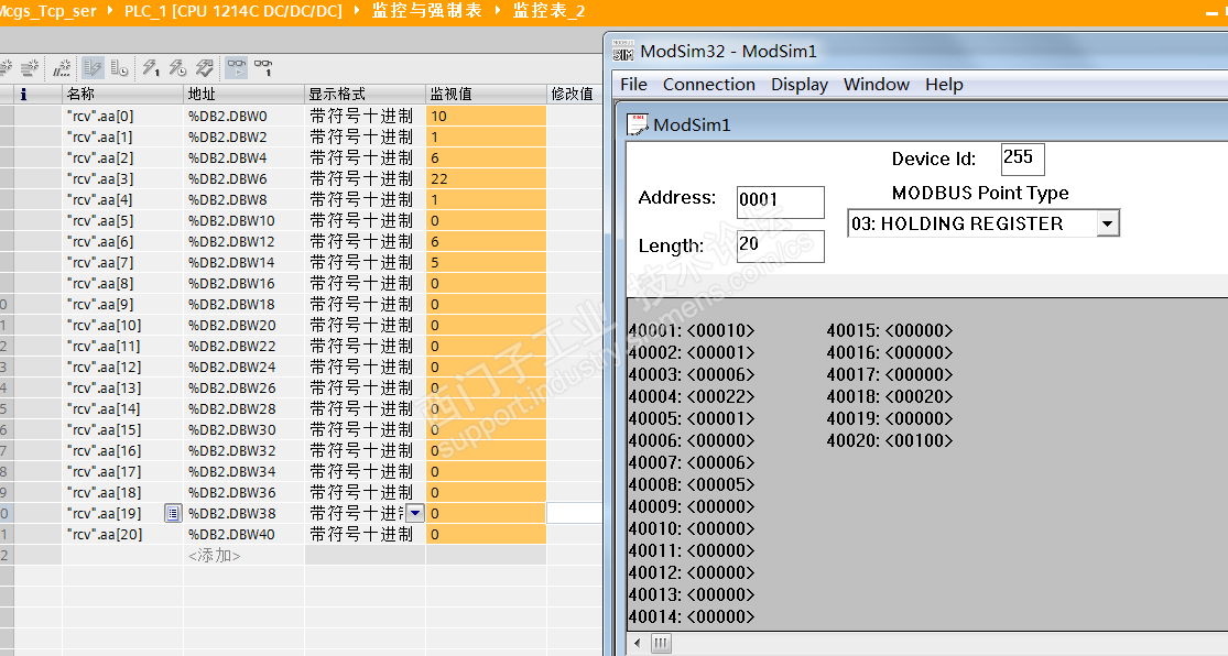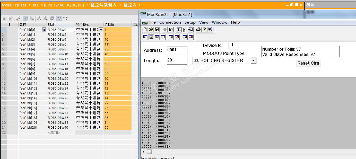 改变服务端或客户端40001-40010任意数值(PLC程序中读取数据为10个),两边的数值均会同步改变;