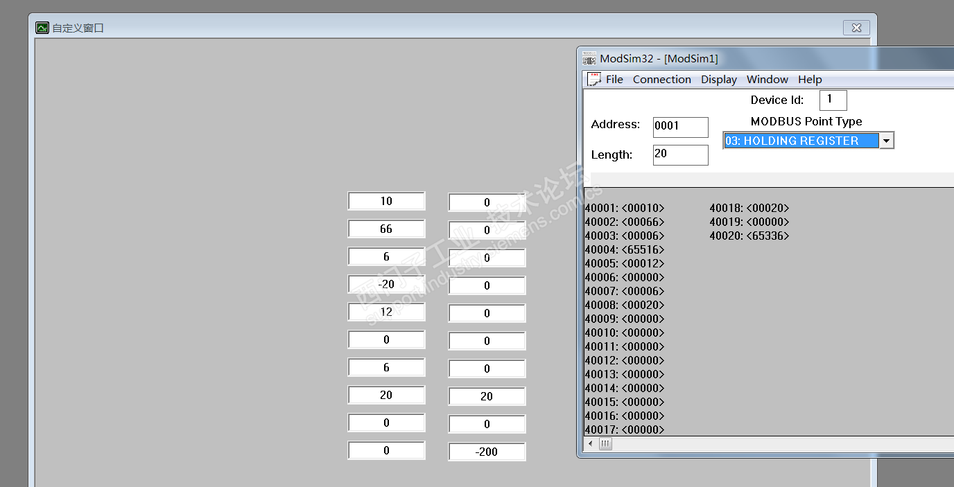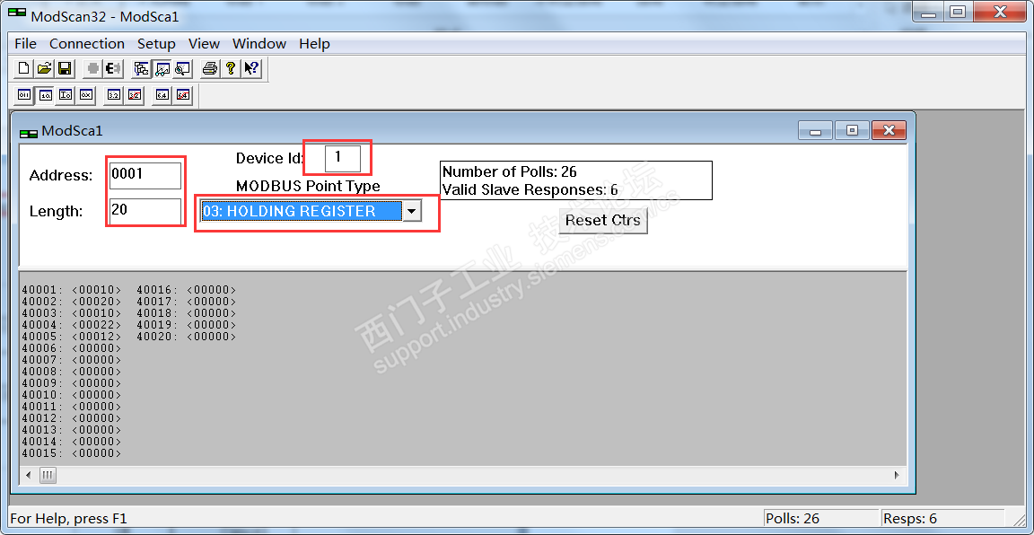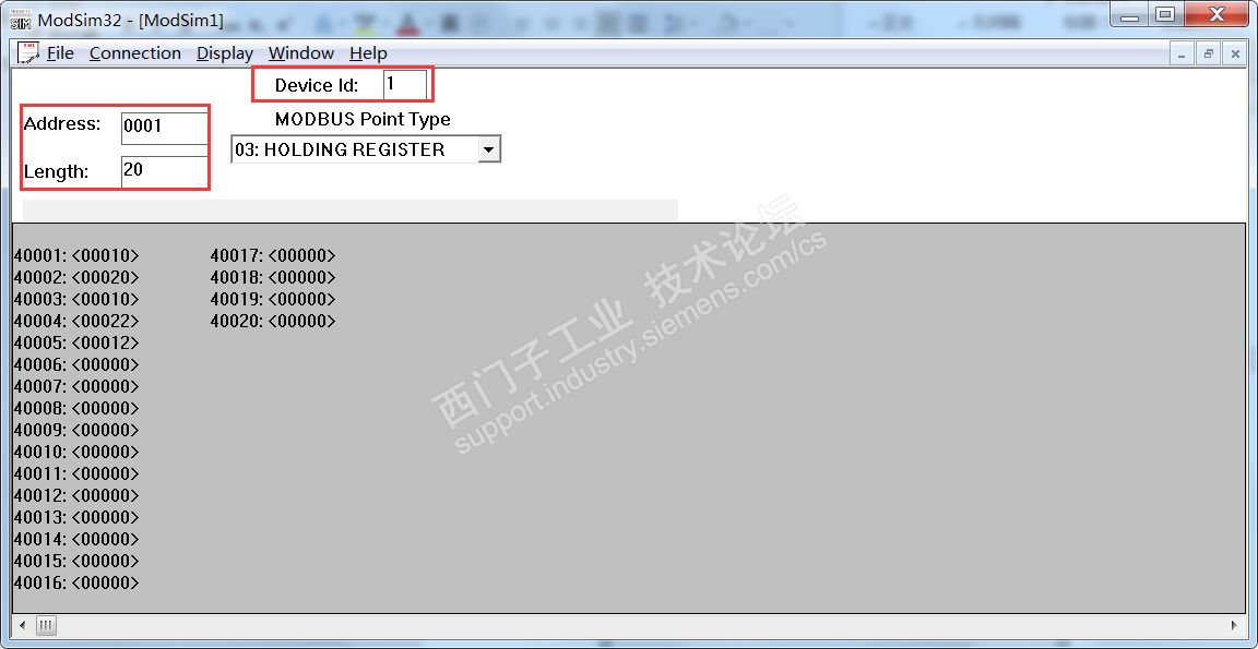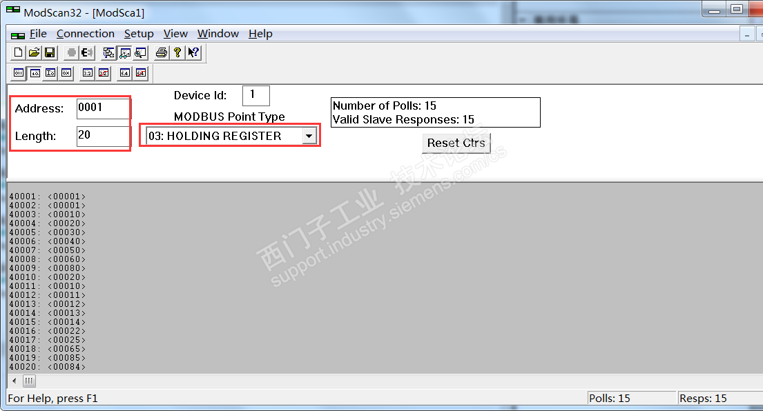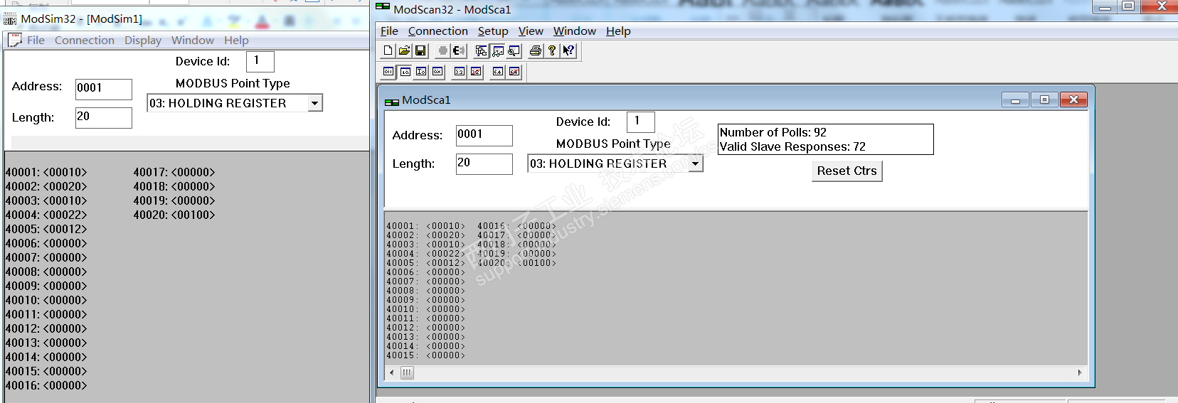 设置modscan地址为1,数据个数为20,通讯模式为03