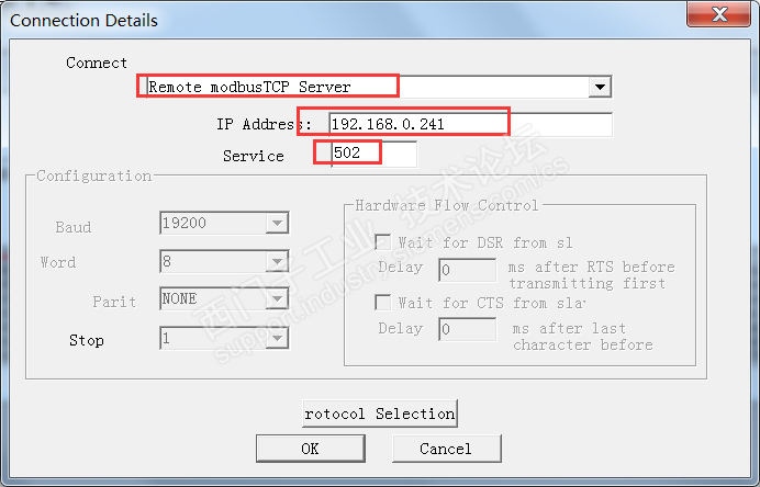 2.1.2. 设置通讯模式为modbus/tcp svr,在弹出对话框中设置端口为502