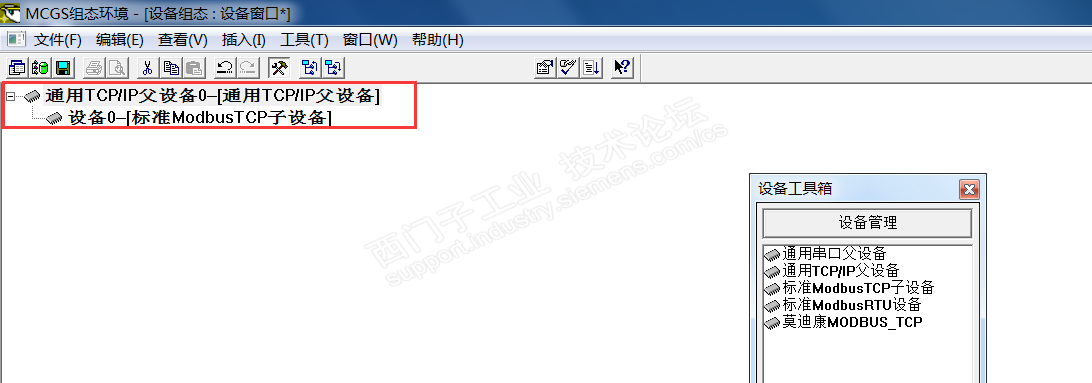3. 使用modbus tcp通用协议,使MCGS上位机软件和modbus测试工具进行通讯测试;测试成功后,再进行MCGS上位机软件与1200通讯测试;