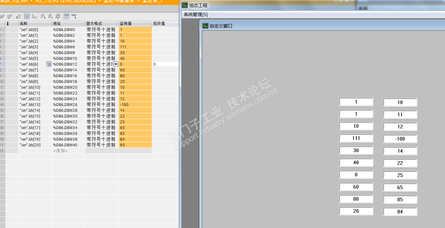 运行MCGS工程,可发现组态画面中数据与PLC中数据一致,任意修改一端数据,另一端数据均会同步发生变化。