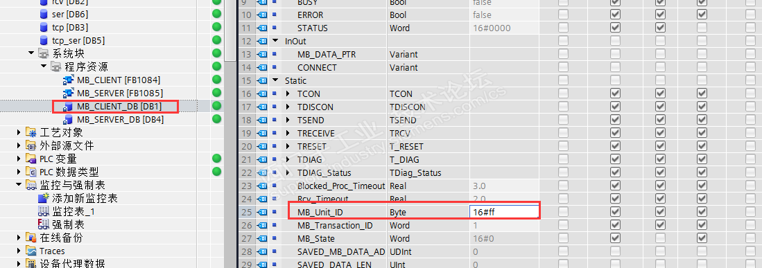 2. PLC作为客户端需要注意通讯系统背景数据块中参数MB_Unit_ID(默认为255),使用ModSim通讯测试软件时,需注意将ModSim中ID设置与PLC中MB_Unit_ID参数一致;