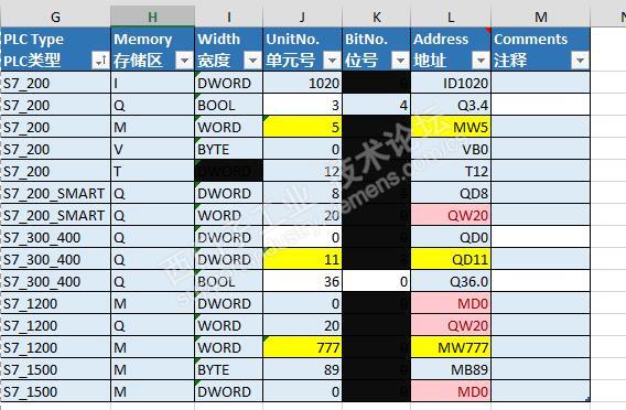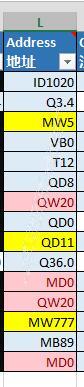 表格具有自动数据检查功能,如图中的黄色部分,是非法地址,针对数据大小如“WORD”“DWORD"的变量,如果设定值不是数字”2“或者”4“的倍数的话,会变成黄色提醒;红色部分是地址和变量名的雷同冲突检测,以红色提醒;黑色部分,是根据变量类型,屏蔽掉其不使用或者不具备的属性。