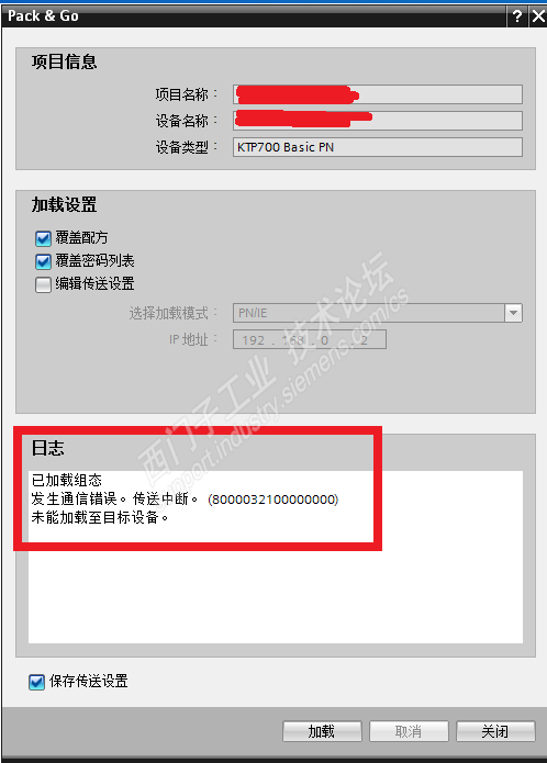 如下图所示,使用Pack&Go将HMI程序从电脑传到HMI的时候报错:
