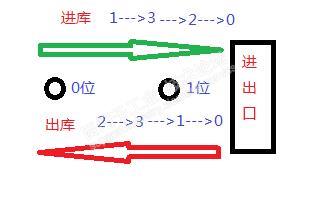简单两个开关量,使用位权法,一个0位(值为0或1),一个1位(值为0或2),8421,比较数字,0位单独ON时值为1,1位单独ON时值为2,两者同时ON值为3,比如进库时是由1变3,或者由2变3;出库时是由2变3,或者由1变3,如图: