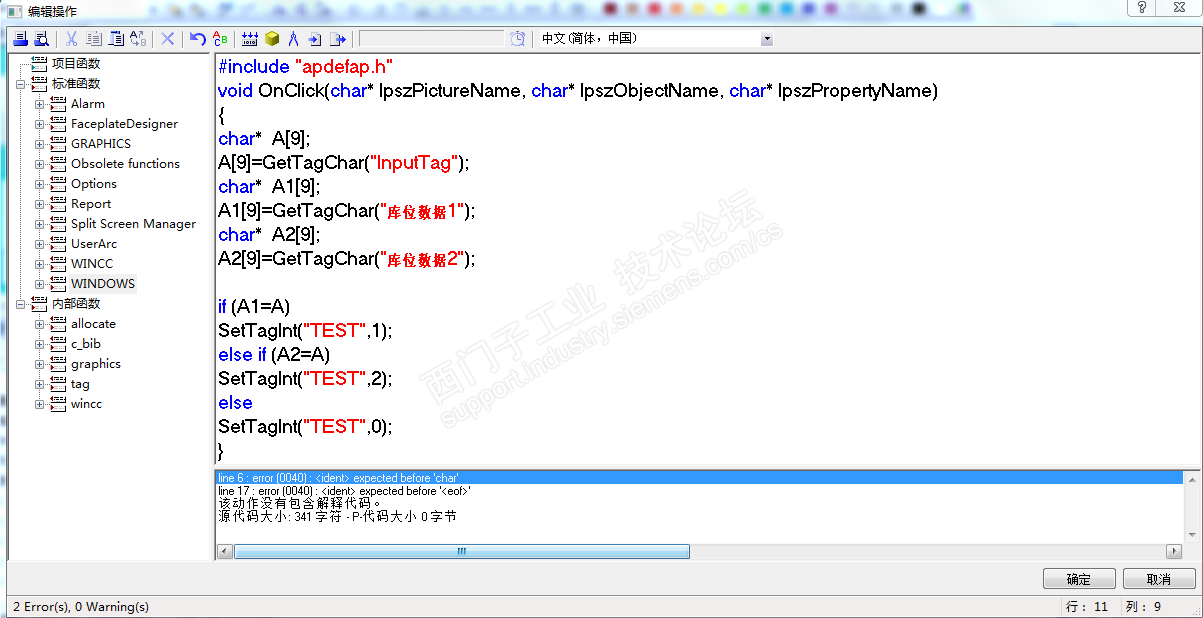 我是想通过wincc I\O域的输入字符串的值,来跟变量表里的库位数据(数据类型为字符串)进行比较,若某个库位数据跟该 I\O域的输入字符串的值相等,则把对应的序号赋值给变量TEST,图片中的错误点在哪,还请各位老师指正!