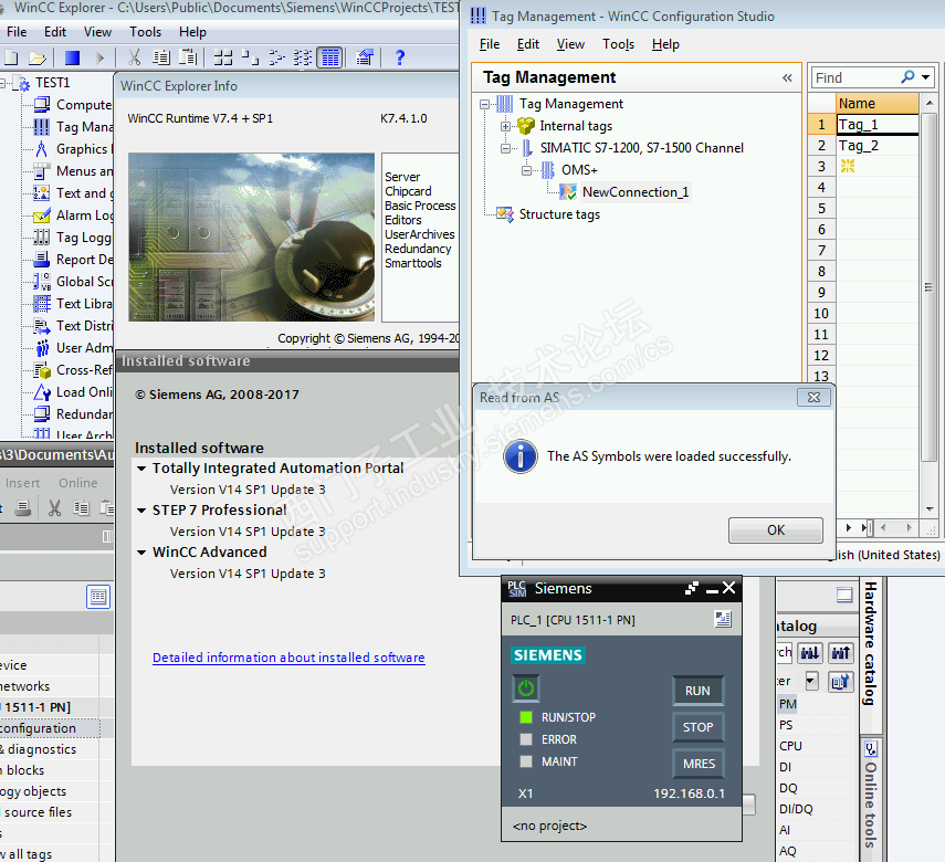 安装了TIA V14SP1以及PLC SIM V14SP1 ,WINCC V7.4,经过验证WINCC无法与该版本仿真器连接.看来必须要使用PLCSIM ADVANCED V1.0才能实现仿真的连接.