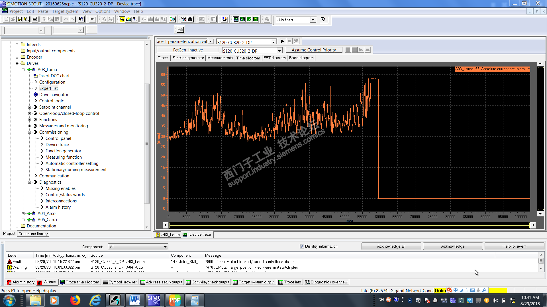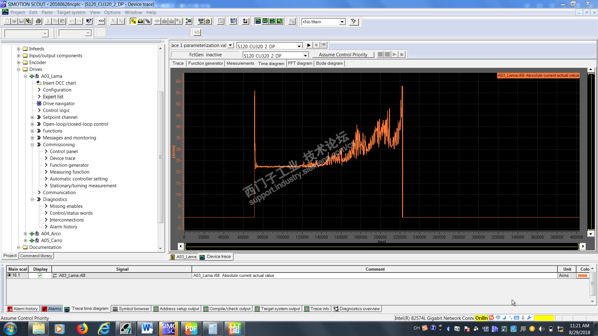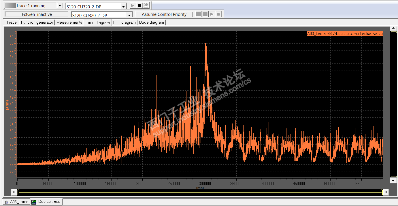 今天开始试切钛合金坯料,转速38r/min,进给2mm/min。锯切过程中主电机电流上升至58A额定电流,出现7900报警。录制不同的PI波形如下: