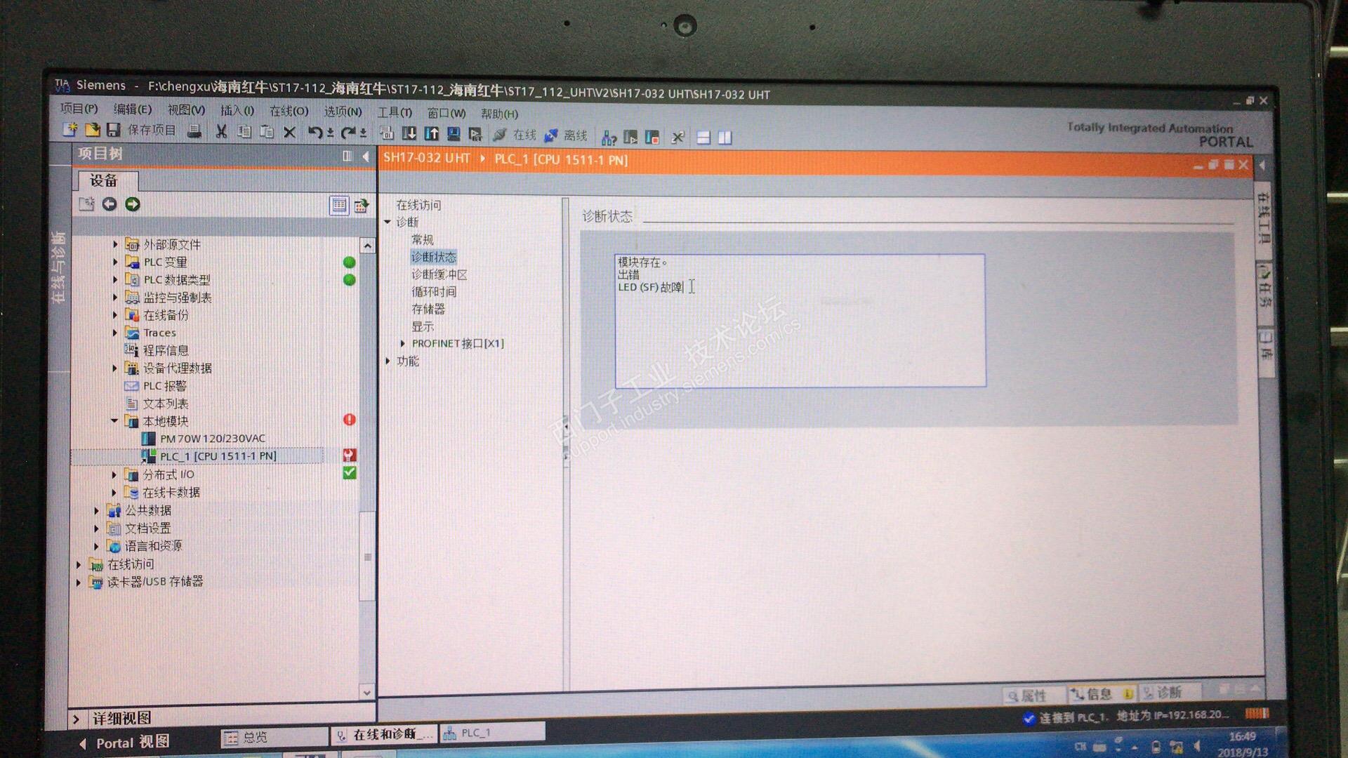 今天试1500PU的在线,本来没连上,后来更改PC/PG端口就连上了,在线,发现CPU有问题,诊断后发现诊断信息是:模块存在出错LED(SF)故障。然后在现场观察其他站的通讯,没发现问题。不过发现CPU那里一直在跳红灯,我拍了视频由于格式的原因没有办法上传,详细的信息请查看附件的图片,请求大神的指点啊