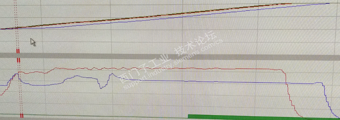 两台G120同步运行,各带一台电机。其中一台在带载加速过程中偶尔会出现速度反馈跟不上速度给定,导致两台电机运行不同步。附图蓝色的线是出问题的一台(加速时电流上不去),红色的线是正常的一台