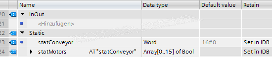 3.在声明表中输入想要用新的数据类型覆盖的变量。例如:名称"statConveyor",数据类型“Word”。