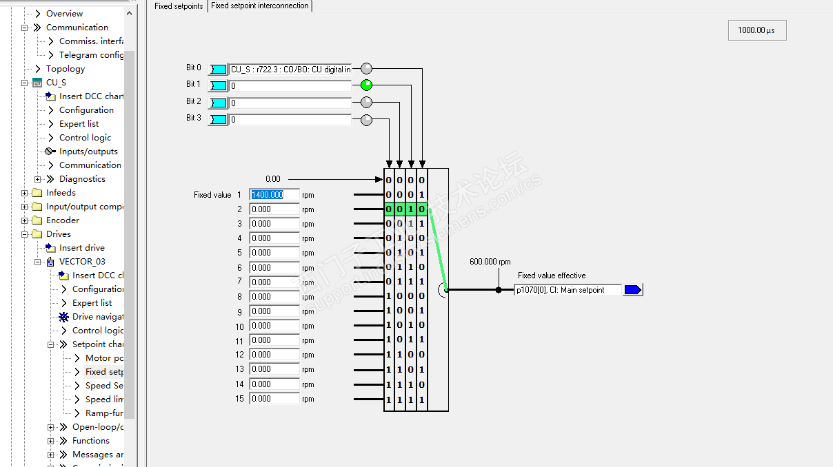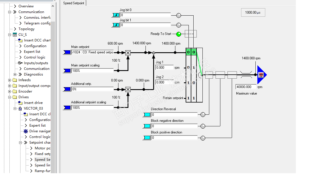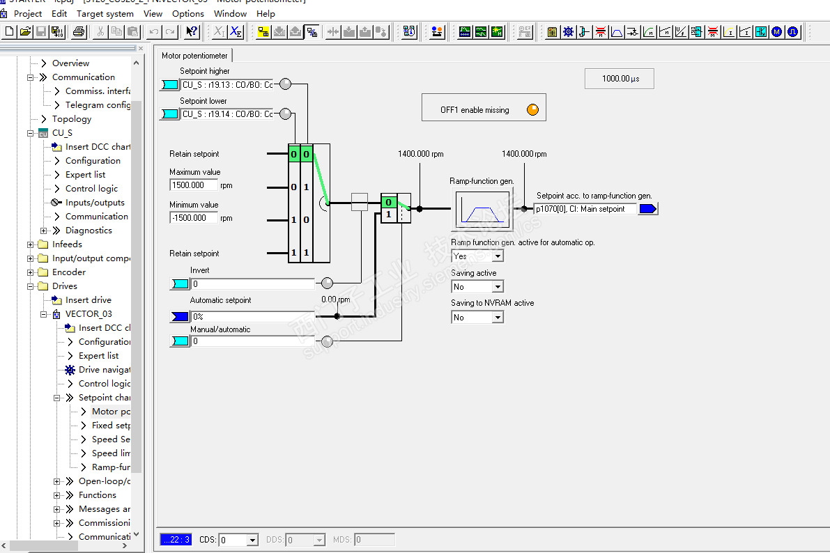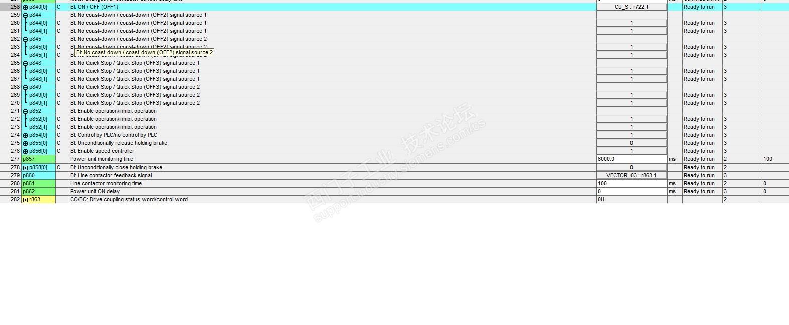 是啊,oFF1就是减速停车啊,搞不明白到底怎么回事。之前给定是变频器启动,p840=1以后,变频器按斜坡时间加速到起始速度p1040=1400r。停机的时候直接断p840,不是减速停车。之后我给改成固定值给定,可以减速停车。见下图:
