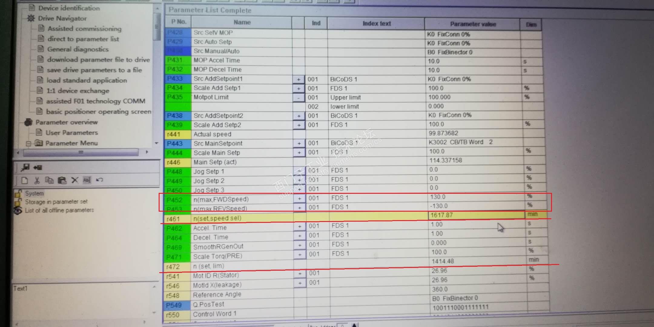 P452和P453,由原来的105已修改130,设定转速是1617,但是在变频器上反馈的最高速度值还是1414.