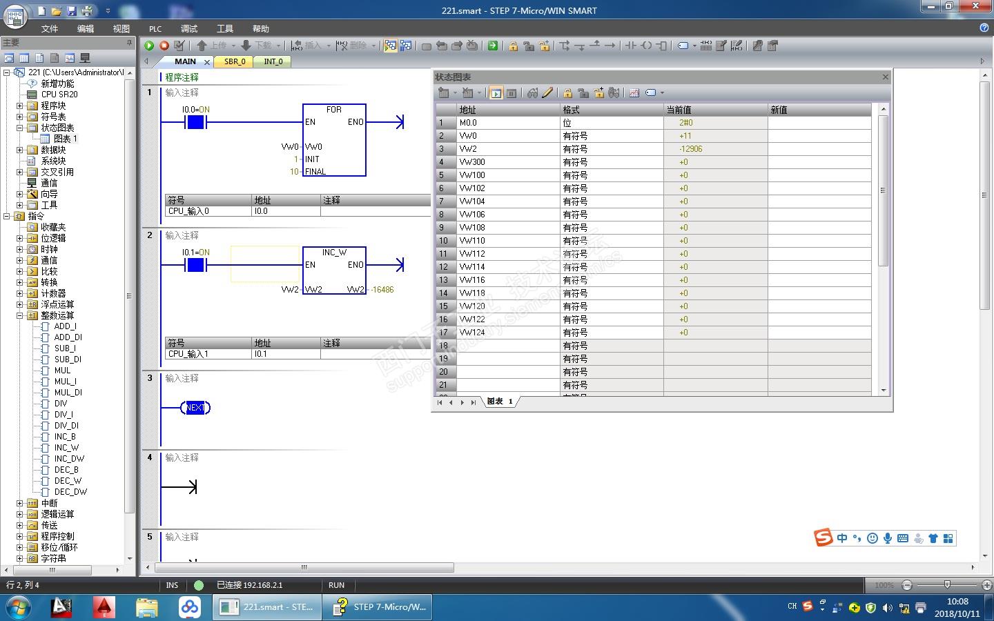 是不是由网络一到网络二再到网络三之间循环十次当INDX的值变为十一大于FINAL的值,次循环就停止?为什么现在I0.0 I0.1同时接通vw2的值还是一直增加的?