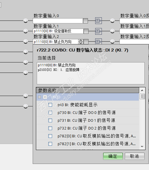 上周测试一台G120,设计成了硬接线方式,但是硬件回路不是按照西门子宏定义的,所以需要修改端子连接参数,当增加连接参数时,一个端子就会连接两个参数,怎么能去掉一个呢?问400回复的BICO支持同时连两个参数,也可以设置成只能连一个,找了半天确实没找到,有大神指点一下呗。