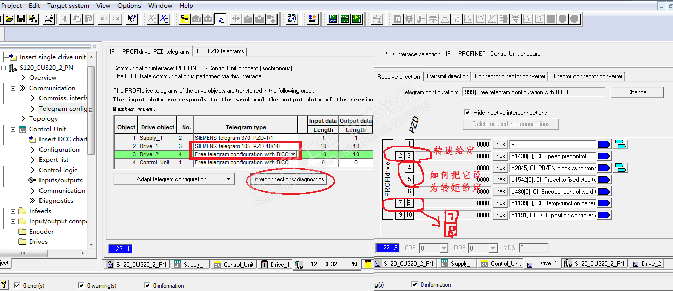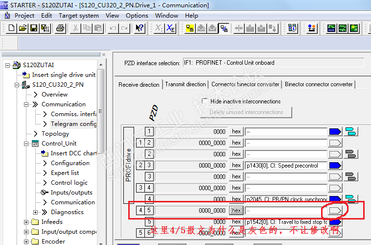 请教一下,S120系统,有1个CU320-2PN,1个整流单元带2个驱动单元,驱动单元的报文我设的是telegram10,PZD-10/10,然后修改成自由报文。接下来我打开interconnection/diagnostics按钮,想在receive direction里修改报文,打算把控制字4和5设为转矩给定,控制字6设为爬坡上升时间;可是报文是把2和3做成了一个双字,但把4、5和6做成了单字,请问在修改报文时如何把4和5这两个单字改成双字作为转矩给定啊?或者说,如何把转矩给定的参数改成双字啊?