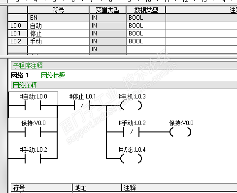 以这个为例,将电机手 自 停做成一个子程序或库文件,方便多台电机控制时,简化编写繁重度,如何设置保持这个线圈的类型,可以使一个电机操作时,不会影响其他电机状态,目前已知将保持设置成Lx.x,类型改为INOUT,但这样会使调用程序时会引出这个引脚,没有起到简化作用,在问下,涉及到时间时,要满足上述要求,定时器又如何设置。