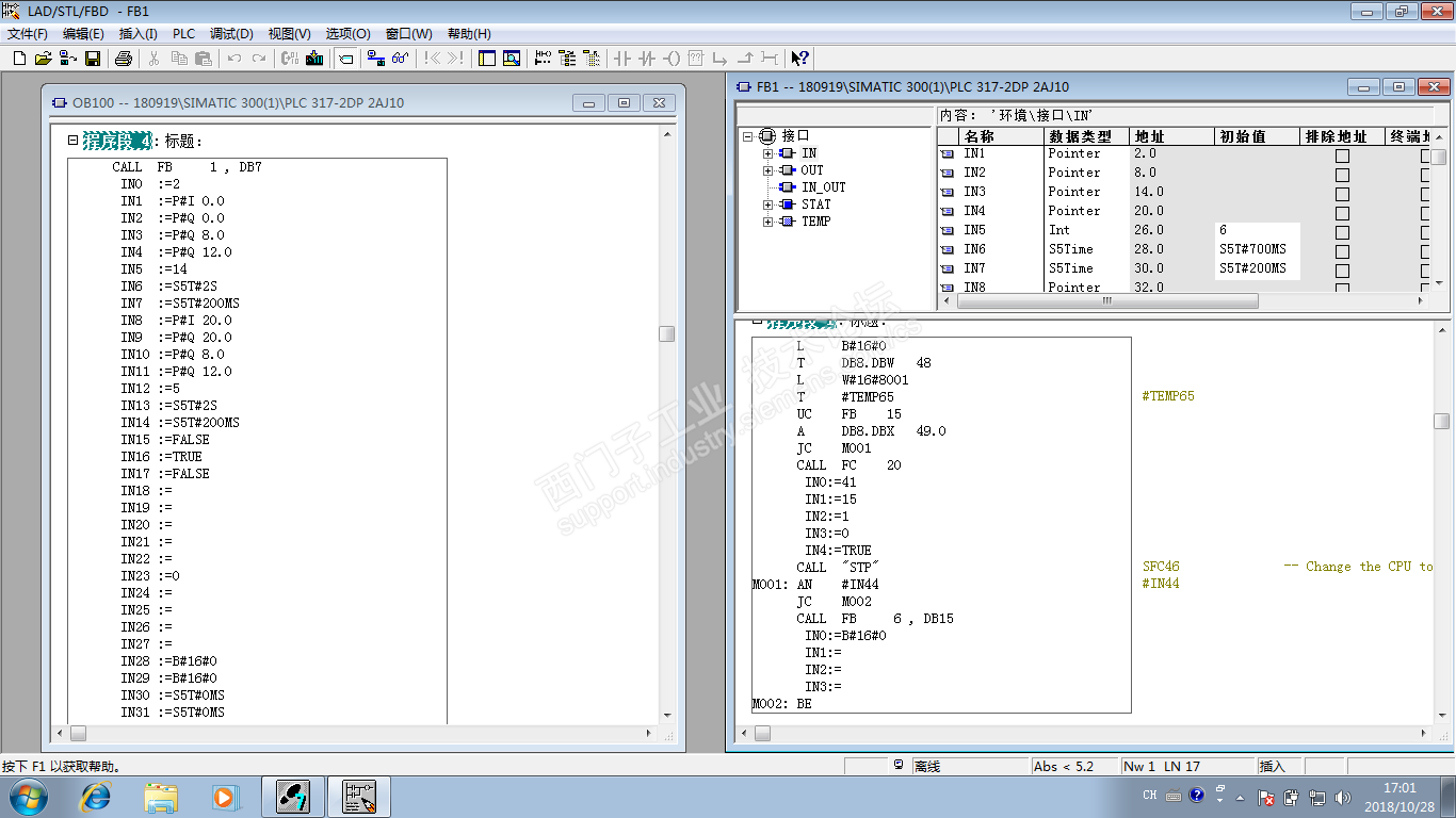 1、程序在OB100中调用了FB1,并给FB1的输入管脚赋了很多值,打开被调用的FB1能看到输入管脚被如数分配,但是在程序体中却绝大多数都没有引用,想问问这个程序是什么意思,OB100中给FB1管脚赋值是分配到FB1哪里去了?看不懂,求高人解释下这段调用程序,在线等,多谢各位了
