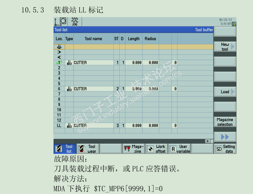 一台840DSL系统的龙门铣床,安照正常的操作步骤,卸刀出现“卸刀错误”,装刀出现“装刀错误”。检查刀库新建刀号中有把刀前显示“LL”,其它正常的刀显示的刀库号都是“0”,这把出现问题的刀库号是“9999”,确定是这把刀导致刀库无法卸刀,或者装刀。该刀没有删除的选项,无法删除。查找简明调试手册的刀具管理章节,发现有解决这种故障的方法,如下图。