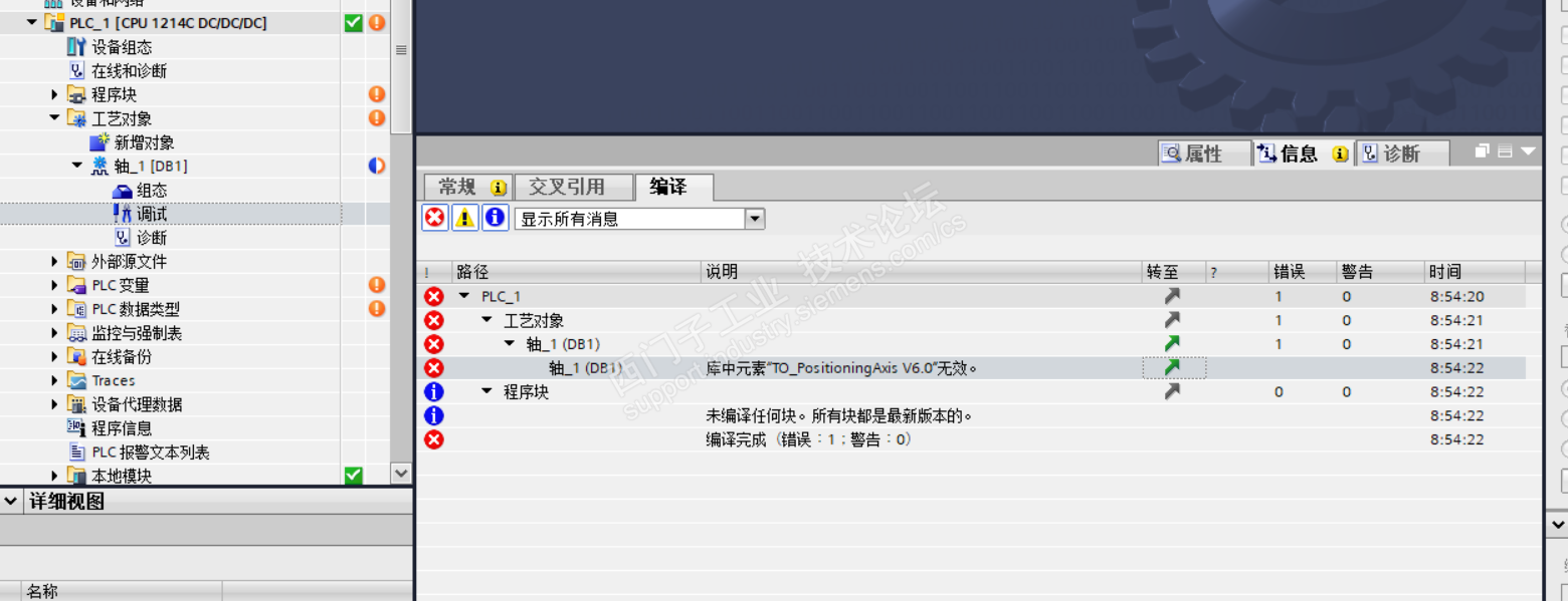 我用博途V15建立了一个工艺轴,V90驱动的,我在工艺组态里面都设置好后想下载到PLC,结果说编译出错,